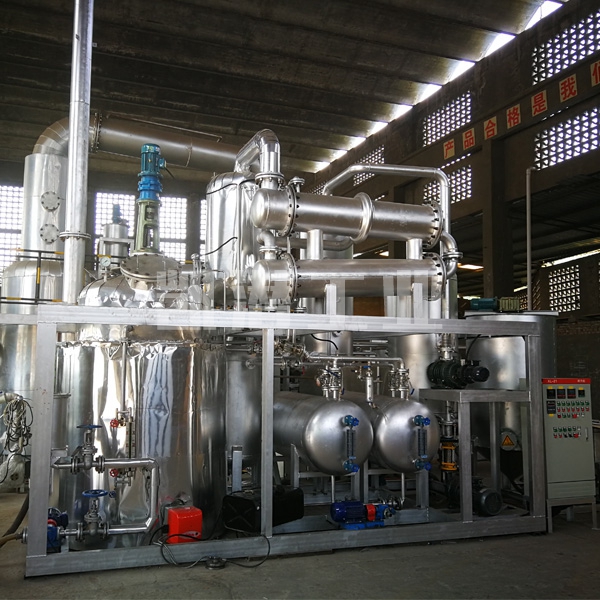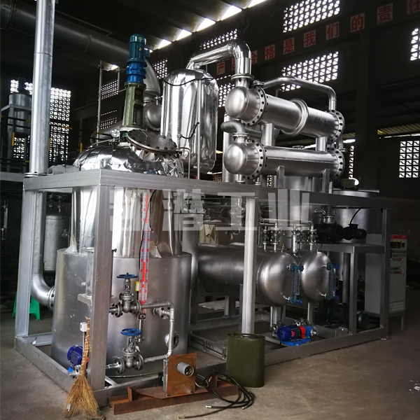 3.1 采用高真空刮膜蒸發(fā)器,分離程度高,遠(yuǎn)高于傳統(tǒng)蒸餾器。普通的蒸發(fā)器在300℃的時(shí)候就開始碳化結(jié)焦,導(dǎo)致回收的油品質(zhì)量明顯下降,且回收率也明顯降低。因廢機(jī)油里的膠質(zhì),瀝青,游離碳等雜質(zhì)非常多,所以采用高真空刮膜蒸發(fā)器可有效的防止這些物質(zhì)結(jié)焦,有效保障設(shè)備長期運(yùn)行的同時(shí)還能提高廢油產(chǎn)量。